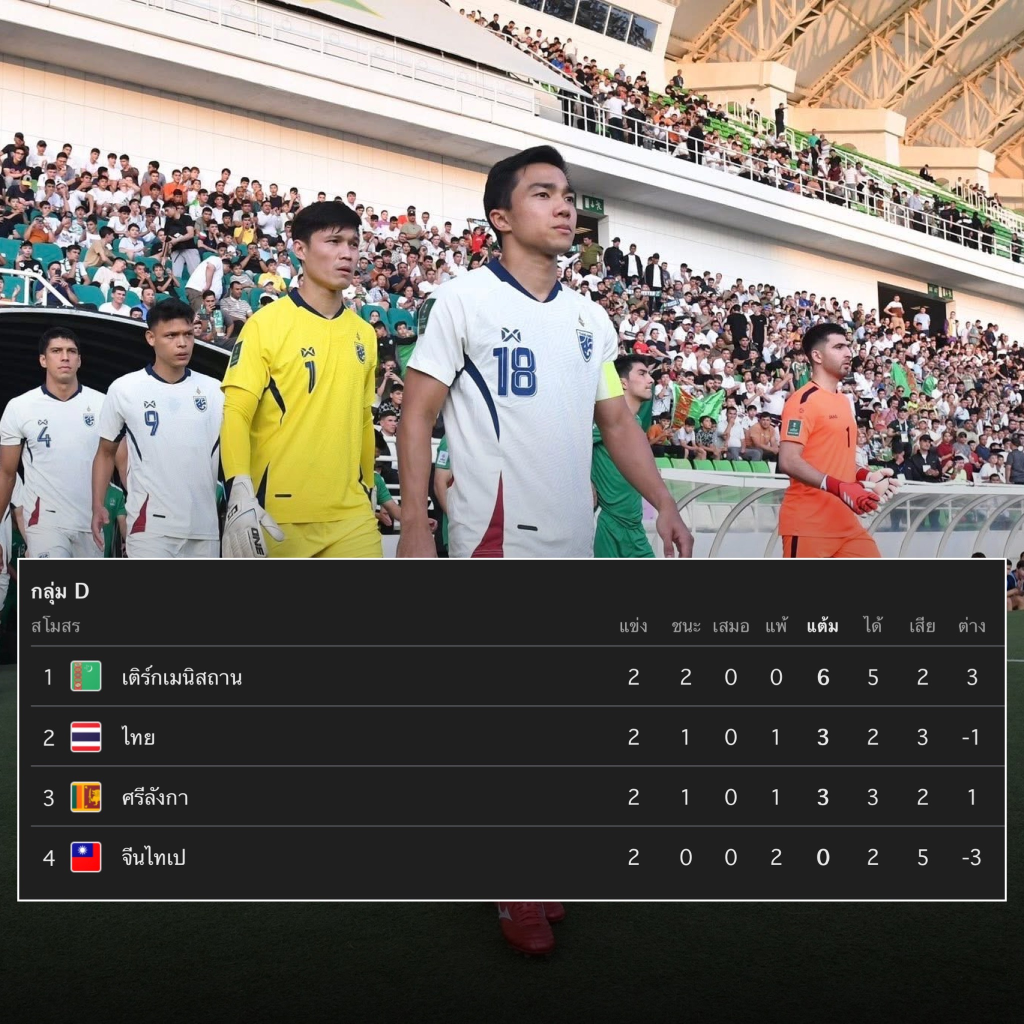 ส่วนเกมที่สอง “ช้างศึก” บุกไปพลาดท่าพ่าย เติร์กเมนิสถาน 1-3 ทำให้เจ้าถิ่นจากเอเชียกลางเก็บ 6 คะแนนเต็ม หลังจากเกมแรกบุกชนะ ไชนีส ไทเป 2-1